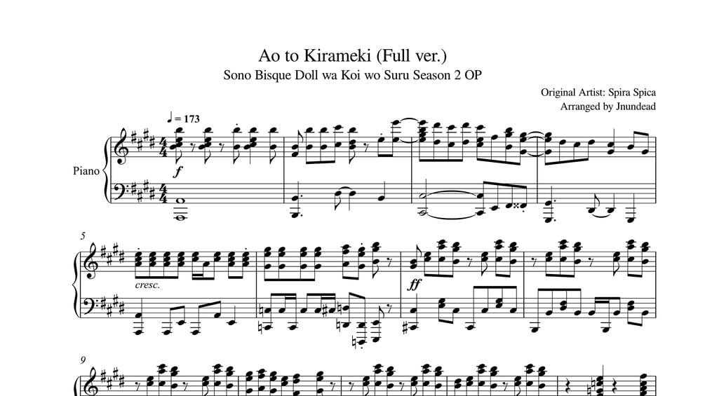 [Sono Bisque Doll wa Koi wo Suru Season 2 OP] Ao to Kirameki (Full ver.) Piano ArrangementJnundead - Anime on Piano$2+2usdPDF Only$3+3usdMIDI Only$5+5usdPDF + MIDI32usdName a fair price:$I want this!Add to wishlist New wishlistShareShare on XShare on Facebook Copy linkCopy product URL