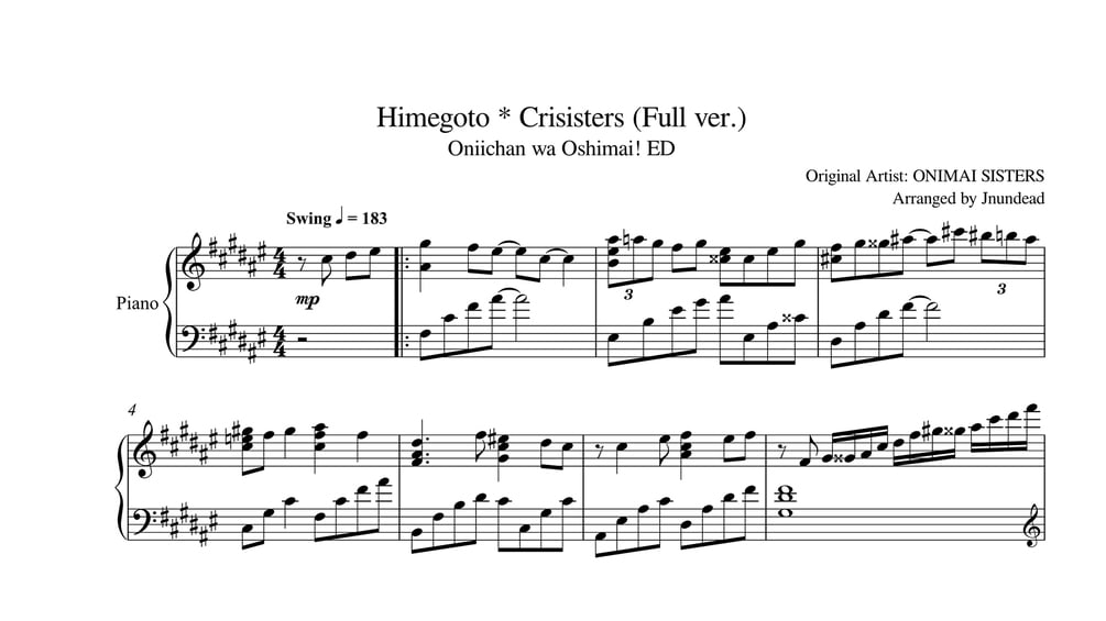 [Oniichan wa Oshimai! ED] Himegoto * Crisisters (Full ver.) Piano ArrangementJnundead - Anime on Piano11 ratings$2+2usdPDF Only$3+3usdMIDI Only$5+5usdPDF + MIDI32usdName a fair price:$I want this!Add to wishlist New wishlistShareShare on XShare on Facebook Copy linkCopy product URLRatings4.9(11 ratings)114.95 stars91%4 stars9%3 stars0%2 stars0%1 star0%